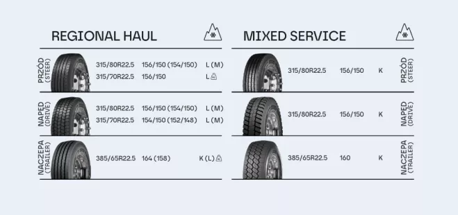 Ukierunkowana na najwazniejsze rozmiary, certyfikowana gama produktów Point S Tyres Truck obejmuje osiem kluczowych referencji. Wszystkie zaproponowane rozmiary posiadaja certyfikat 3PMSF (Three Peak Mountain Snow Flake), gwarantujacy doskonałe osiagi w warunkach zimowych. Opony sa wytwarzana w Europie przez producenta TBR Premium, szesc obecnie zaproponowanych rozmiarów jest produkowanych w Polsce, dwie w Turcji.